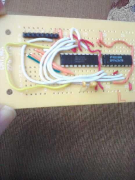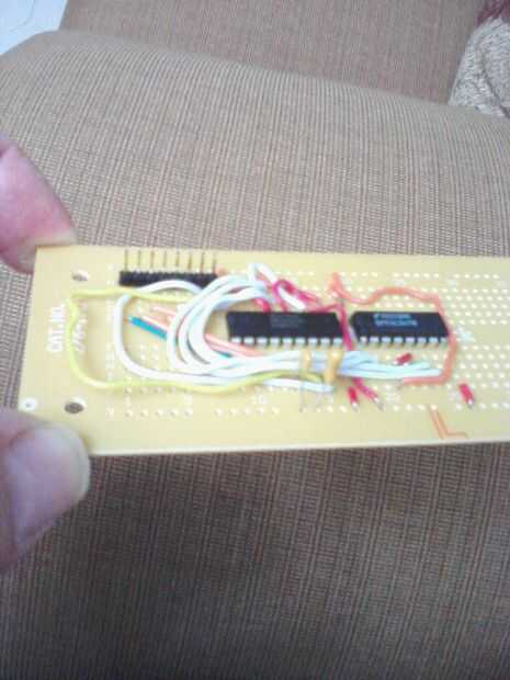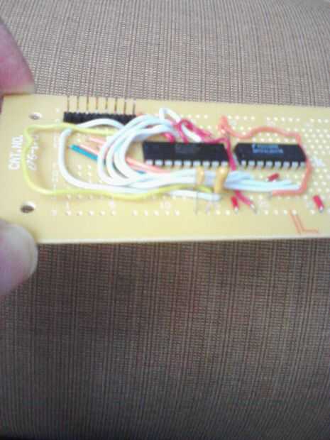 Una vez insertado el IC7447, hacer las conexiones con el resto de los componentes recordando siempre que la mejor ayuda es tu esquema. Desde 74C922, pins 14, 15, 16, 17 a 7447, pins 2, 1, 6, 7 respectivamente. También recuerda, que tienes que conectar los capacitores a tierra y a la IC74C922, la de 0.1uF a pin 5 y el de 1uF al pin 6 de este IC.