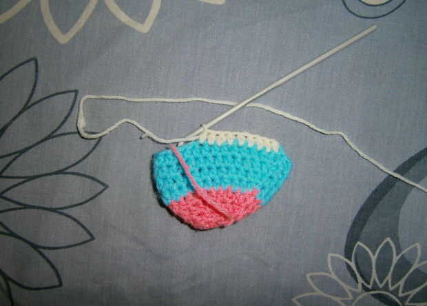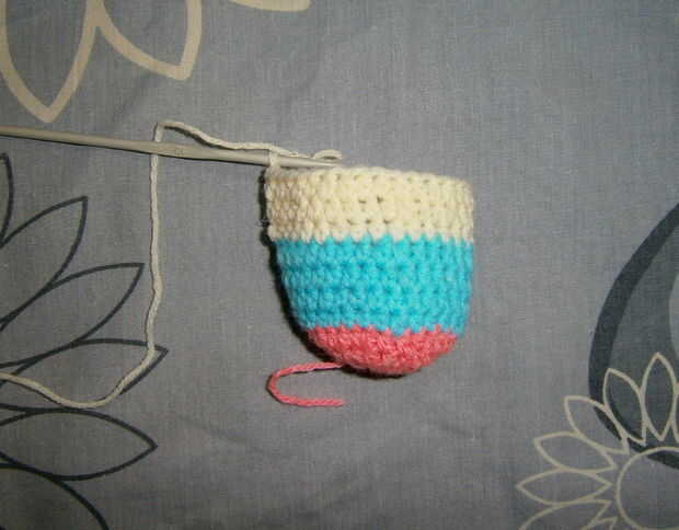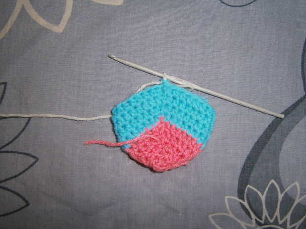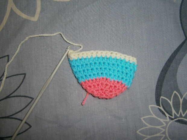 Tomar el hilo del azul crema. Trabajo 1 hdc en cada puntada de 4 filas.