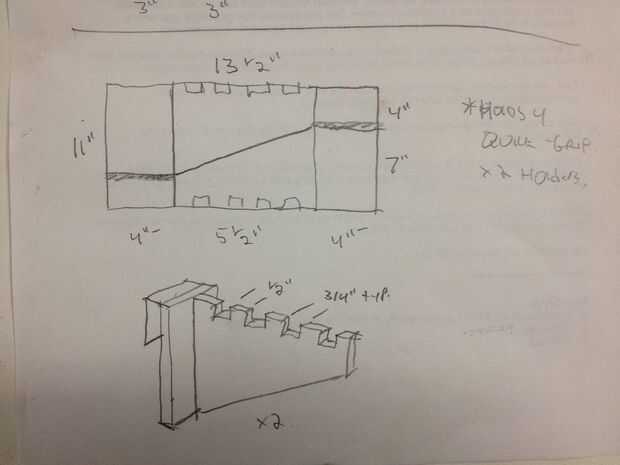La segunda imagen es un plan para dos parrillas coincidente de la abrazadera que sostiene hasta cuatro abrazaderas de sujeción rápida. Cometí un error de medición, que dio lugar a poder caber 6 apretones rápidos en lugar de cuatro.