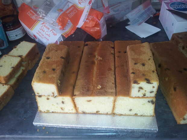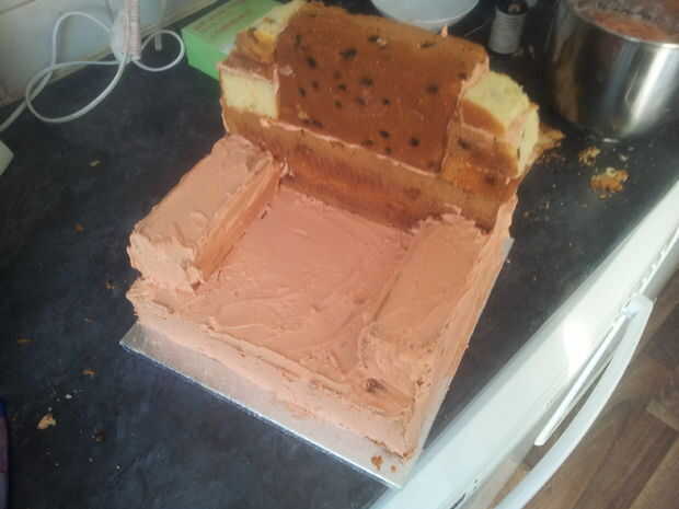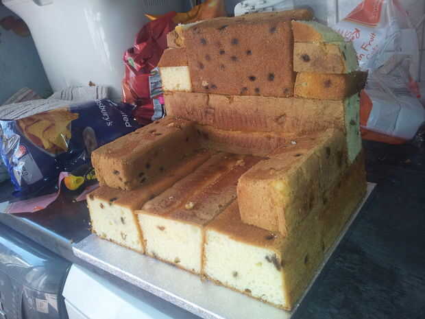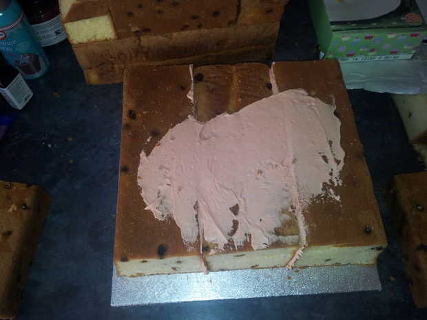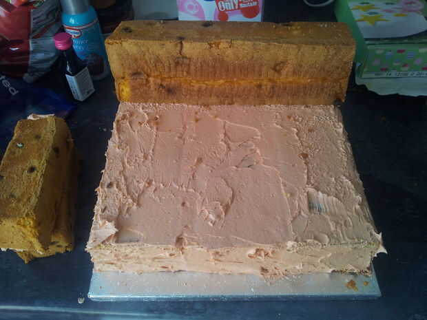 una vez fue la consistencia adecuada pegadas las losas de la torta y les cubrió.