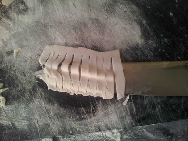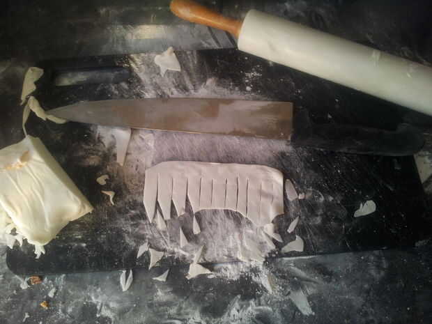 luego cortar las tiras de espadas como en la original instructable. Usé un cepillo y una pequeña cantidad o agua para ayudar a palillo (que es probablemente incorrecto pero la solución se acerca)