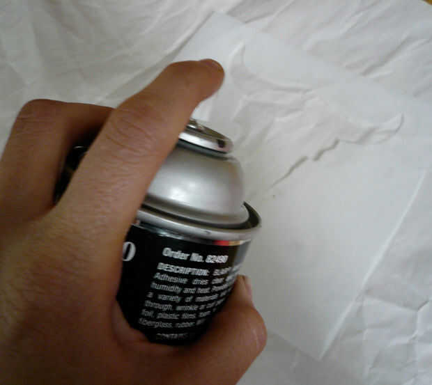 Rocíe la parte posterior de la plantilla con el adhesivo en aerosol, no necesita mucho de él, un poco a mantener la plantilla en su lugar, desde mi experiencia - lo menos mejor que mejor, incluso una pequeña capa por toda la plantilla es suficiente.