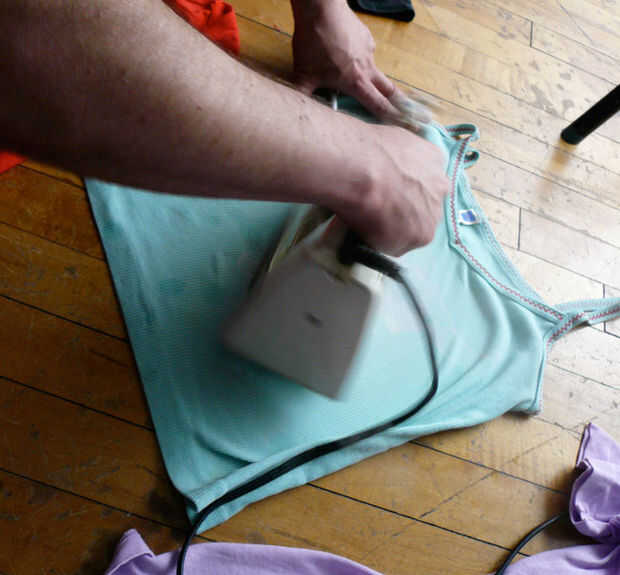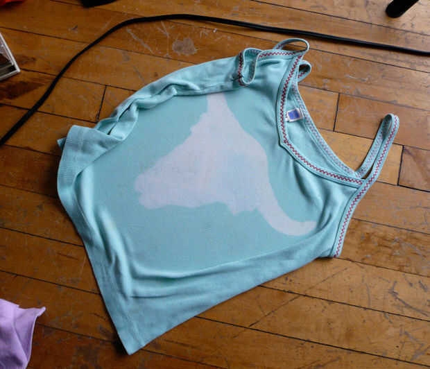 La descarga pegar a reaccionan diferentemente a diversas telas, camisetas de algodón son generalmente maravillosa para esto, pero con otras telas, no siempre funciona como bien (o nada) probé una falda de lana y consiguió un resultado muy sutil. También, el color del área que fue blanqueado tienden a tener diferentes colores en las camisas de diferentes colores, me encanta lo negro se descolora a un vago amarillo-blanco, una camisa azul clara consiguió perfecto blanco y el rojo consiguió una naranja amarillo.