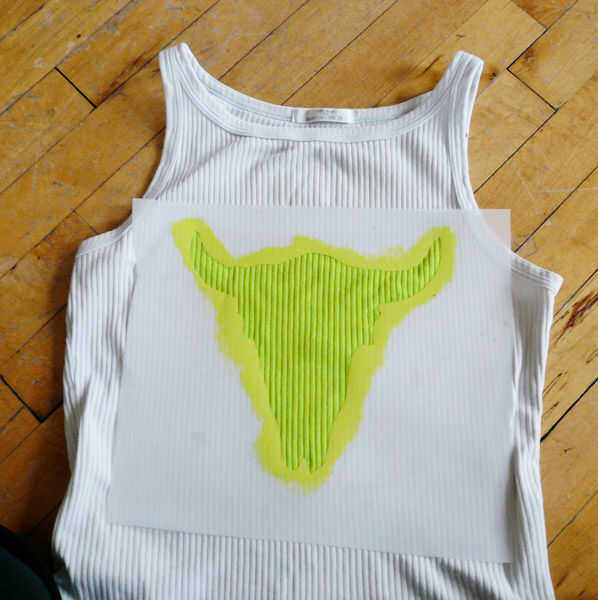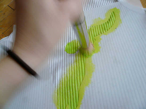 Hacer la capa de pintura uniforme y tan ligero como sea posible, si usted es esténcil una camiseta oscura con un color claro y necesita cubierta mejor entonces hacerlo 2 o 3 capas de pintura fina en lugar de una capa gruesa. Cuando la pintura esté en la camiseta es menos cómodo y no se ve tan buena.