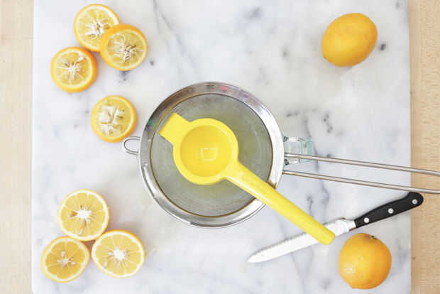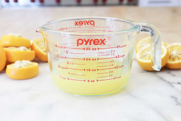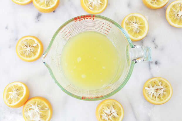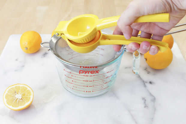 Jugo de los limones en una taza o taza para medir. Es mejor usar un colador para evitar que entre cualquier pulpa.