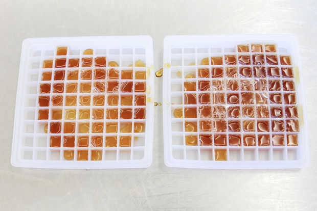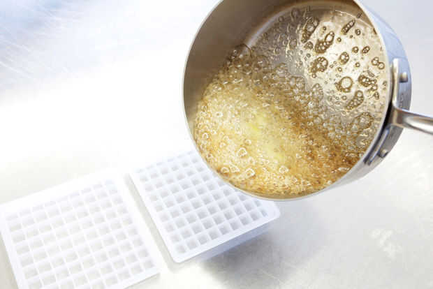 ingredientes caramelo de cristal3 tazas de azúcar1 taza de aguablanco 1 taza de jarabe de maíz1 cucharada de saborizante o extractoPocas gotas de colorantePaso 1: Combinar el azúcar, el agua y el jarabe de maíz en una cacerola. Revuelva constantement