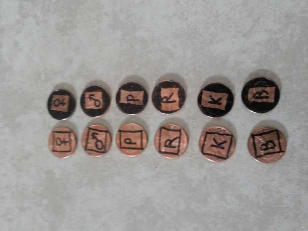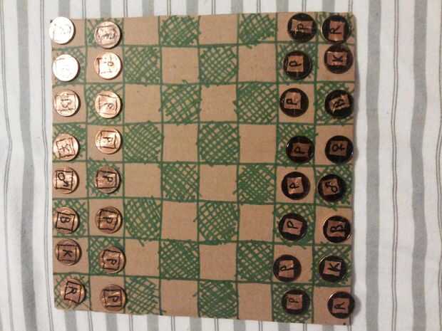 Necesita 36 centavos. Separados en 2 grupos de 16. Se necesitan 8 peones, 2 torres, 2 caballeros, 2 obispos, una reina y un rey para cada conjunto. Asegúrese de que ambos conjuntos tienen un único esquema estético (no tiene que ser blanco y negro). Dibujar un 8 × 8 cuadrícula y el color. Puesto que el ajedrez es tan conocido que realmente no siento la necesidad de explicar las reglas, pero por si acaso no está familiarizado con las reglas: wikipedia.org/wiki/Chess