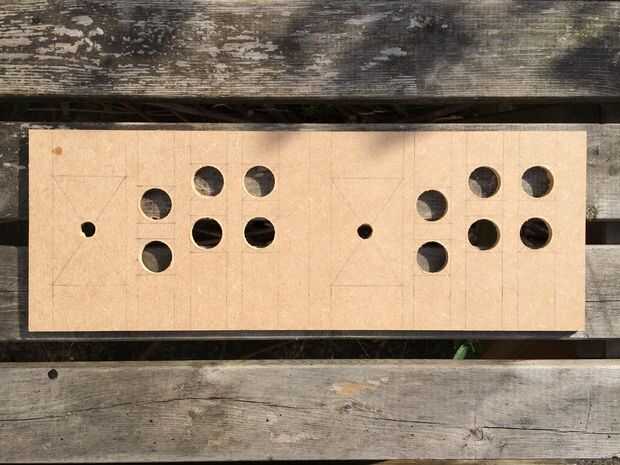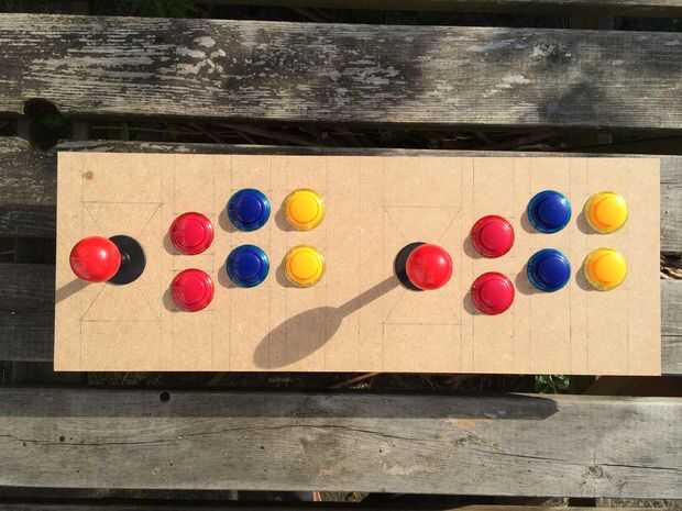 Ordené un sistema de panel de control completo de ultracabs que incluye dos joysticks de estilo japonés (es decir, con tope bola) y 18 botones de varios colores. Después de diseñar mi diseño del panel de control en el equipo que perforado unos agujeros en algunos chatarra madera y configurar un controlador independiente para probar la configuración antes de comprometerse con el gabinete. Esto es una gran manera para poner a prueba la ergonomía del diseño con algún tiempo de juego hecho real.