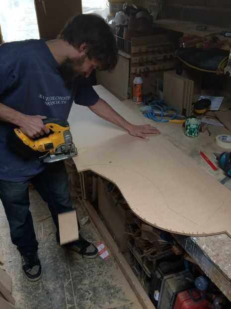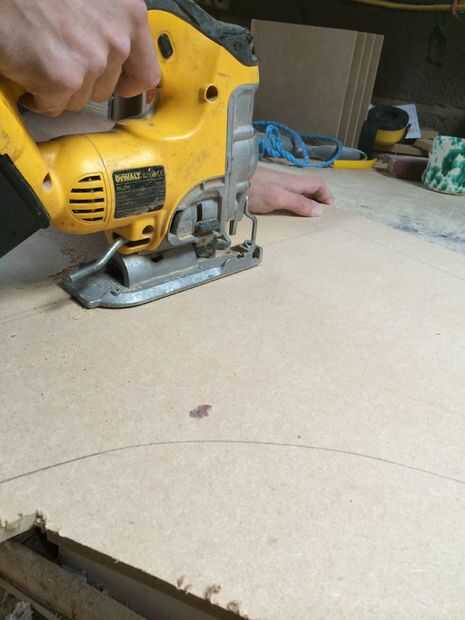 Para los lados con cinta una plantilla impresa en un poco de MDF de 9mm y cortar con un cuchillo stanley para marcar la forma. Esto fue cortado usando una sierra de calar y dado un poco de amor con un papel de lija para redondear los bordes y cosas por el estilo. Su importante ninguno de las esquinas es demasiado fuerte asegurar la moldura se ajuste adecuadamente más adelante. El otro lado se cortó de este utilizando un poco de plantilla en el router así que sabíamos que sería idénticos.