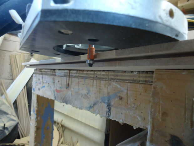 Hay un par de maneras de lograrlo pero con las herramientas a nuestra disposición que nos pareció la forma más sencilla formar los paneles de 15mm con dos piezas de madera más delgado (9mm y 6mm) intercalada juntos. La pieza de 9mm fue cortar y lijar exactamente a la medida, como se explicó anteriormente. La pieza de 6mm se corte muy áspero con unas centímetros de sangrado todo el camino alrededor y luego corte con precisión usando la broca de plantilla otra vez para asegurar que encajaría su otra mitad exactamente.