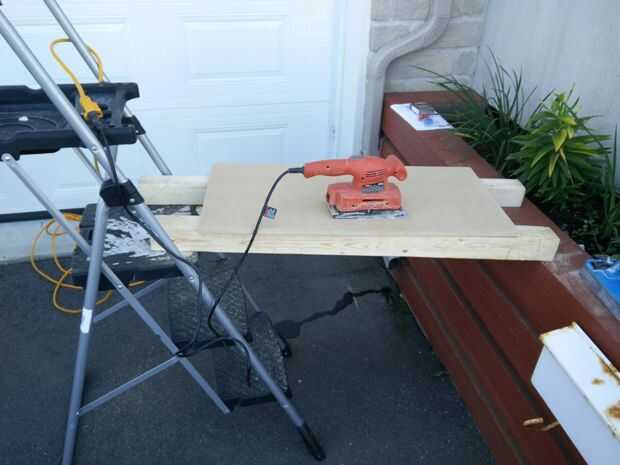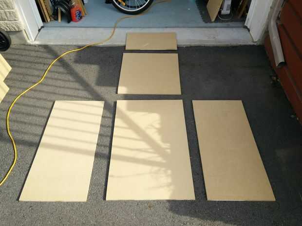 He utilizado 2 hojas 49'x 97' a disposición de las piezas MDF y recorto. Una vez que se cortaron, usé una lijadora eléctrica (áspero papel de lija) inicialmente y luego se toca una lijadora de mano (papel de lija más suave) para el acabado así como las esquinas. Se puede saber de mi setup de palurdo que no era lo más fácil de hacer pero no tengo un banco lo suficientemente grande.