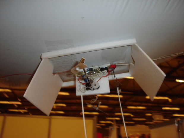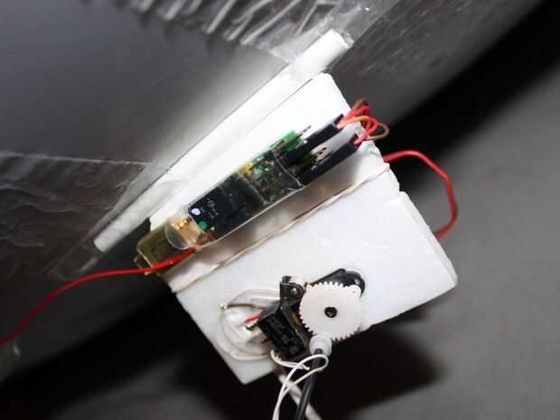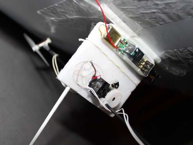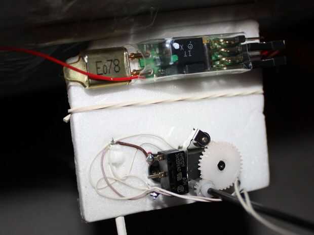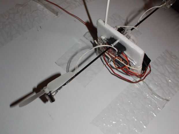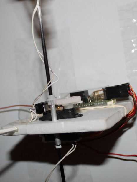 Un servo se mantiene completado. El engranaje más grande se pega (centrado) en un cuerno del servo. El pequeño engranaje se monta cerca de la mitad de la varilla de carbono de 20 cm. Con algunos tubo de montaje como rodamiento de la varilla se pega al servo, alineado de tal manera que coincida con los engranajes. El interruptor micro se pega en el servo, de tal manera que la servohorn puede trabajar. Los motores se pegan en el extremo de la varilla. Los motores se conectan en paralelo al conector de energía que el receptor (todo se ejecuta desde la misma batería, conectada al receptor).