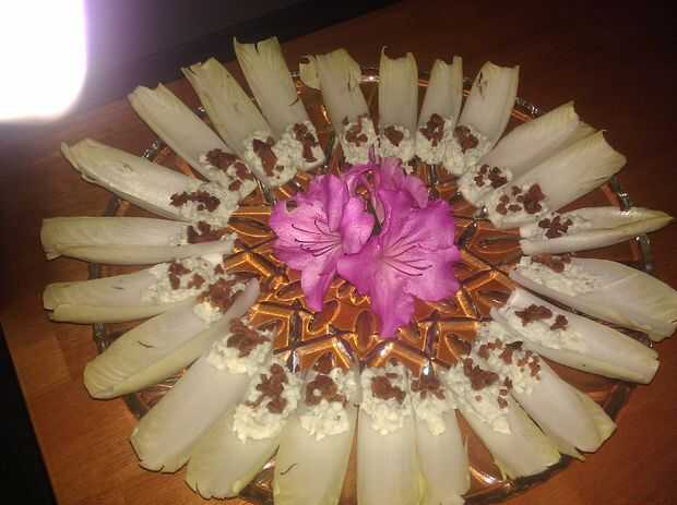 2Bulbs de la endibia, el verde o el rojo.. combination1 lbCrumbled Bleu Cheese6 ozCreme Fraishe, o la crema agria, si te prefer1 lbJalepeno Bacon6 ozCandied frutos secos, nueces, pecanas, lo que te gustaINDICACIONES: