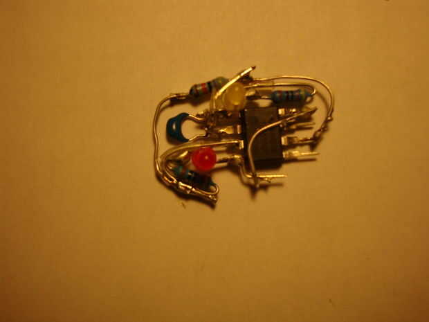 9. crear otro puente con otro pedazo de alambre o recorte de componente. Soldadura del pin 4 en el extremo del cable de LED que dejé allí. Suelde el otro extremo al pin 8. Encogimiento del calor no debería ser necesario. Pin 5 no tiene algo soldado a él.