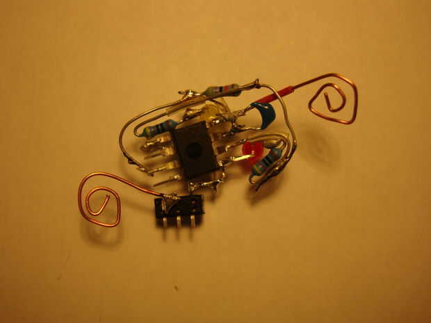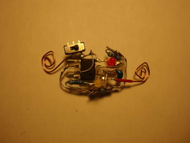 10. dio vuelta el circuito alrededor! Hacer dos q rizado con alambre y dejar un poco de alambre extra para soldar. Uno de los q rizado al pin 3 del interruptor de la soldadura, luego pin uno del interruptor de la soldadura que conecta con el pin 4 de la 555. La segunda q rizada con conector de uno de los 555 de la soldadura. Finalmente se realiza el circuito!