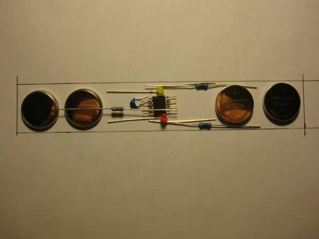 Poner todas las cosas que van a figurar en tu pulsera en la zona que se desea. Todo debe encajar bastante bien. Algunos ajustes son posibles, pero no todos. He decidido ponerse las pilas cerca de los extremos y el circuito en el centro. Si no está usando este circuito, asegúrese de que todos los componentes caben y que será capaz de mover y doblar.