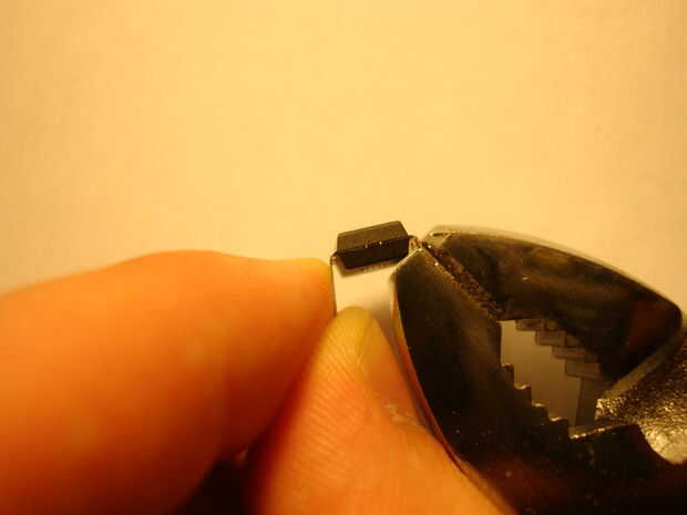 1. cambiar la forma de su temporizador 555 IC-tome un par de pinzas que puede tomar en todas las clavijas de un lado al mismo tiempo. Doblar las patas para que queden horizontales. Repita este paso en el otro lado del temporizador.