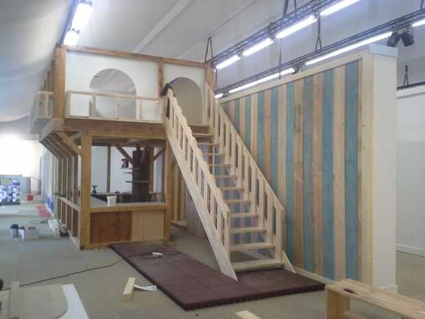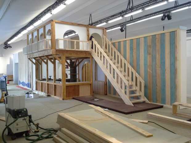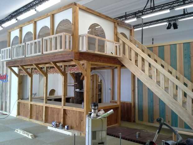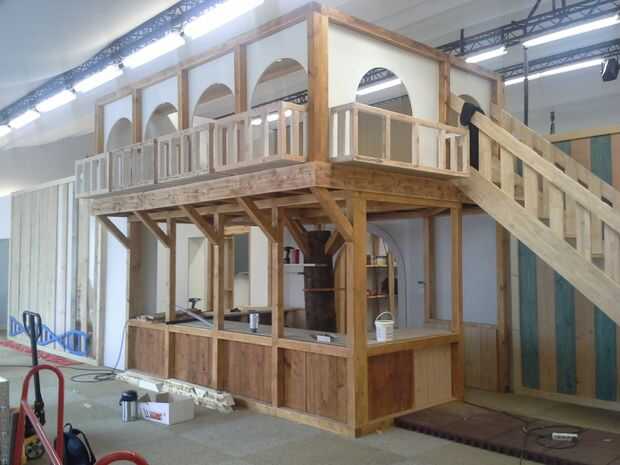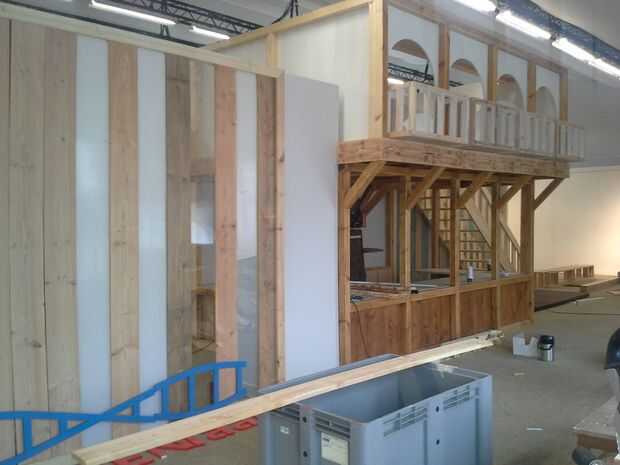 entonces tuvimos que destruir todo y reconstruir el todo en el lugar. Esta es la razón por qué nos hemos asegurado de everthing fue construido en piezas separadas. las vigas fueron pintadas con un woodpaint oscuro. hemos añadido algunos pequeños trozos para que todo parezca más real