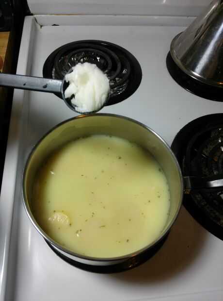 Por último viene el aceite, si tienes manteca, más de lo mejor. Estoy usando aceite de coco, que es lo que sucede que tiene. No añade nada a través de sabor mantequilla lo hace, pero añade grasas a los hidratos de carbono y es una buena cosa. También vira sobre otro 100 calorías.