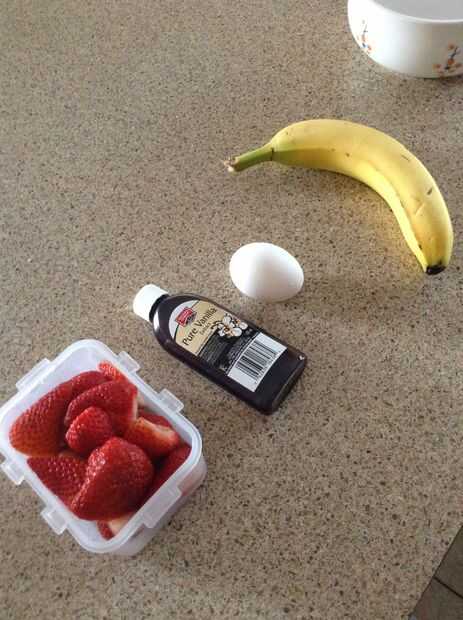 iré añadiendo algún Extracto de vainilla y fresas en el lado pero todo lo que necesitas es: huevo 1 plátano 1 esto sirve una persona.