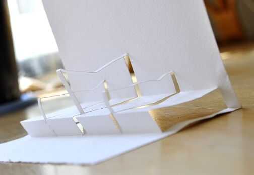 Por último, cortar a lo largo de las líneas en la plantilla. Voltear la tarjeta para crear la forma emergente con la foto de la tarjeta doblada como referencia.