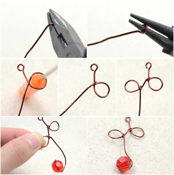 cadena 6, un grano de cristal rojo en alambre y doblar el extremo hacia arriba;