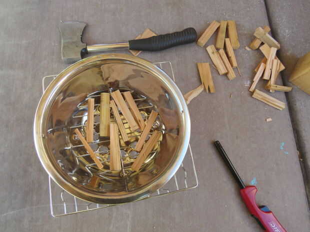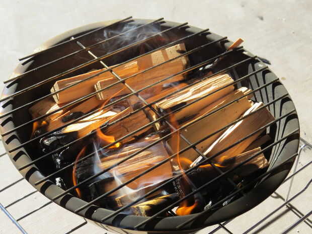 Briquetas de carbón serían un gran trabajo pero hoy estoy utilizando madera. Llene el tazón de madera y se deja coger el fuego. Colocar tapa y deje que el fuego salir. Ahora usted tiene un montón de carbones de madera. Puede poner sobre una sartén o parrilla tu comida con uno. Sólo asegúrese de que usar algo para levantar la tapa ya no está aislado.