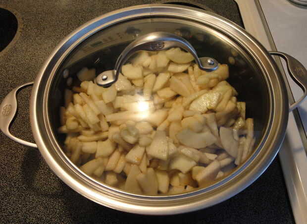 3 1/2 libras de manzanas, peladas, tubular, en cuartos y rodajas finas (yo usé una mezcla de Golden Delicious y Granny Smith y Gala).