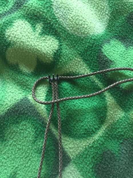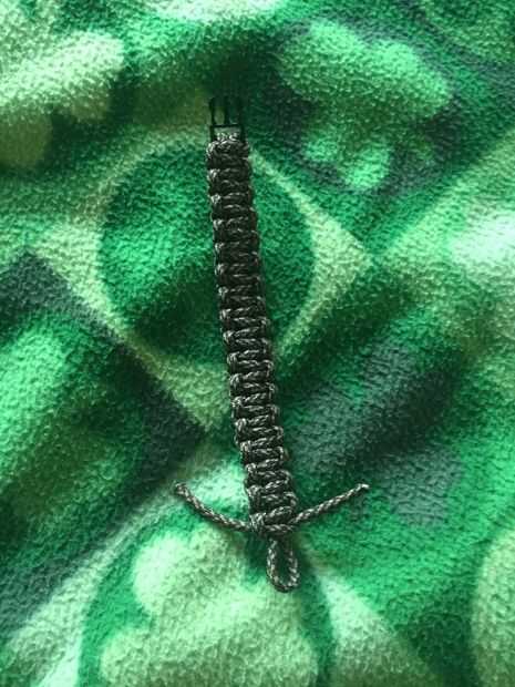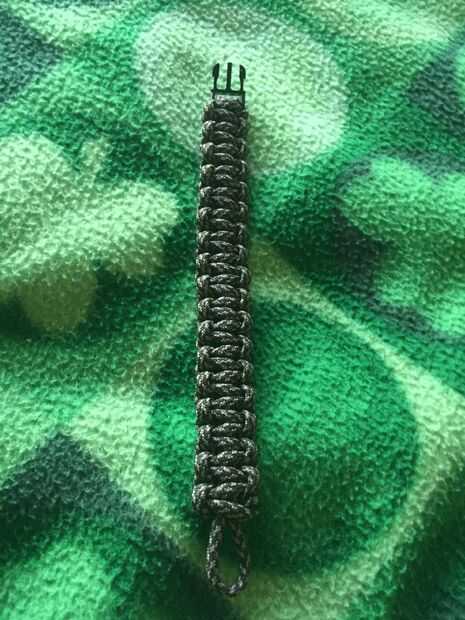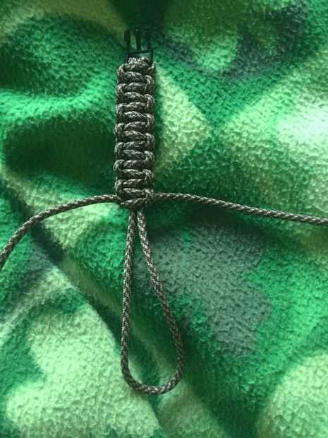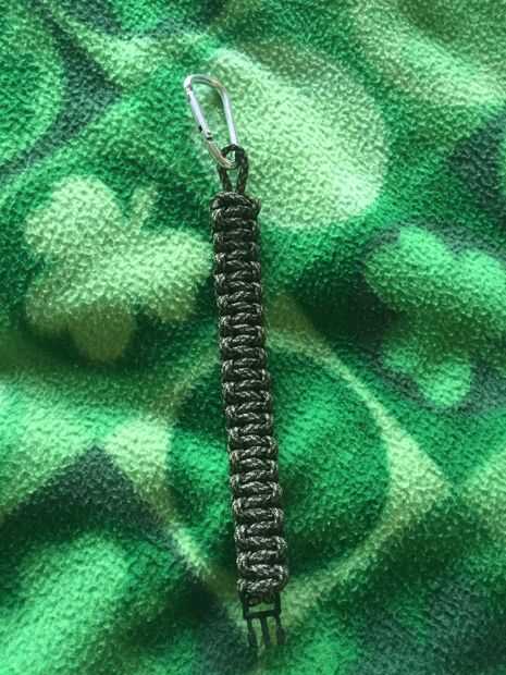 Continuar el patrón de alternancia. Eventualmente usted se quede sin paracord, cortar los extremos y derretimiento/sello les con su encendedor. Ahora coloque el mosquetón o anillo de llavero a través del lazo, lo que le queda.