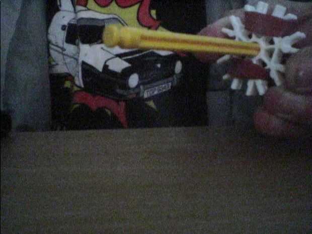 Poner la barra de color amarilla o roja a través del agujero en el conector del copo de nieve y empuje hacia atrás. sostener por detrás donde está la goma, apuntar a algo y dejar ir. su que simple!