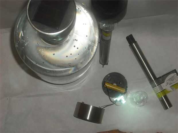 Compré 3 litros botella y 10" solar jardín posterior. Comprar en la tienda de dólar. La estaca solar es modelo 155002 repensar.