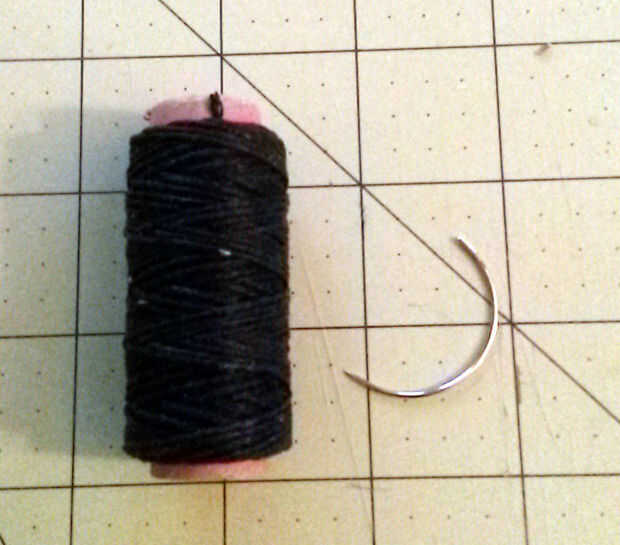 Tire esta longitud de hilo y el hilo de su aguja. No atar el hilo en la aguja como el nudo puede/podrá rasgar los agujeros en sus firmas. .