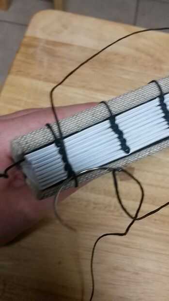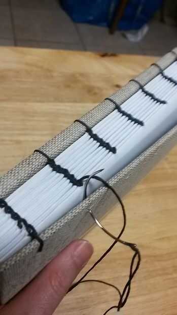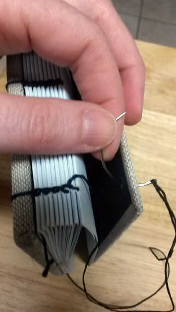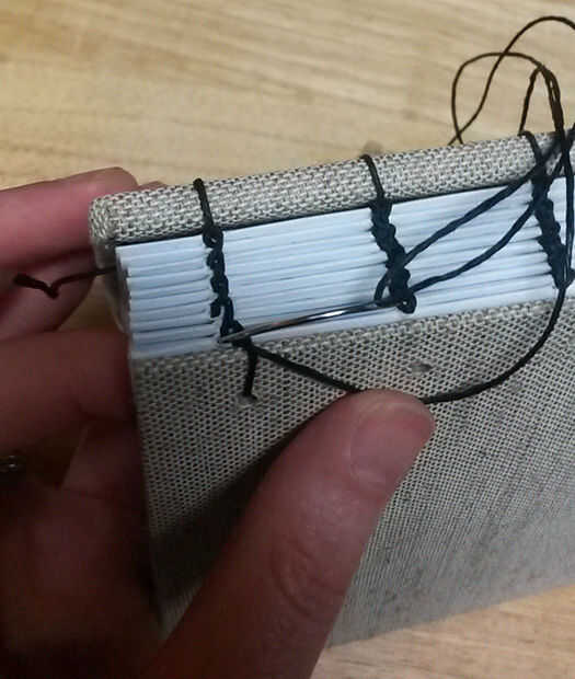 Enhebre la aguja por el agujero siguiente de la firma y repita hasta llegar al final de la cubierta. habrá dos capas de hilo en el interior de la última firma.
