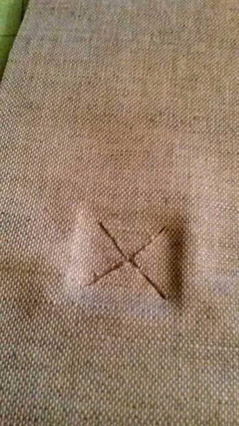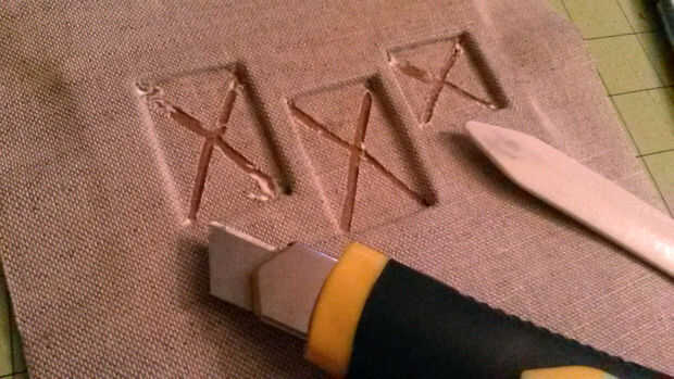Utilice su cortador de caja para cortar una "X" en el centro. Se debe cortar muy cerca de la esquina, pero no tan cerca que el corte puede verse fuera de la inserción. Siempre puede cortar un poco más si es necesario, cortar tan cautelosamente para empezar.