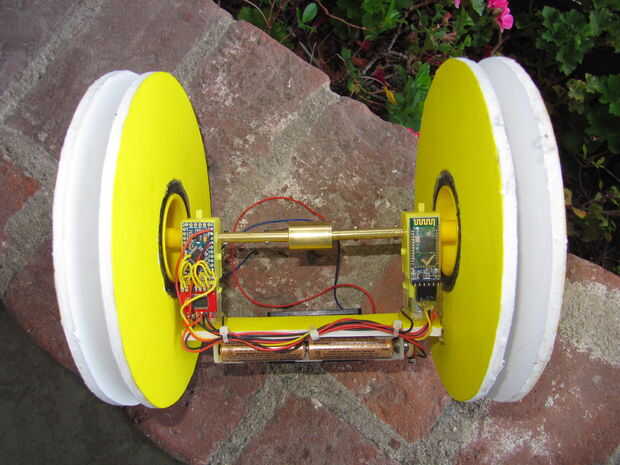 El programa de joystick fue diseñado para 1 motor y 1 Dirección servo, pero su biblioteca L293 ofrece otros modos, como rueda de 2 y 4 modos de la rueda. La biblioteca de L293 es en la primera descarga en la parte inferior de la fuente original, Car_With_Sensors_Continuous.zip (7k). Ha cambiado el programa de 1 motor y 1 servo por 2 motores y sin servos, mediante el uso de una fórmula proporcional en coche la velocidad de la rueda se basa en la información de ángulo enviada por la aplicación. He incluido una función de Donut para divertirse, hace que el robot gire en su lugar ya sea izquierda o derecha dependiendo de si se activa el botón "A" o "B". El robot debe ir a un ritmo relativamente lento; afectadas la A o B botón entonces aumento la velocidad. La cosa va tan rápido es un borrón! Si los leds fueron agregados al robot (ya en el programa), sería una gran exhibición durante la noche.