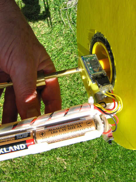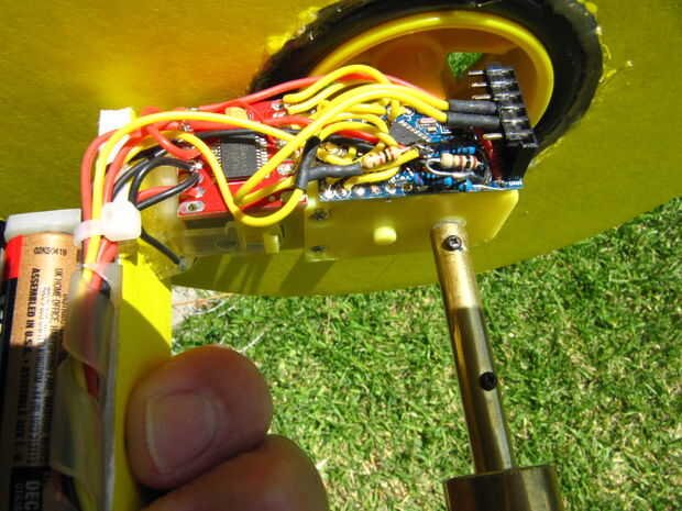 Un 4 AA baterías de la célula titular se encuentra en la parte inferior del robot para minimizar el peso. Soporte de la batería está caliente pegado, fortalecimiento de la tira de chasis de núcleo de espuma. Puedes usar una batería más grande, las células del AA tal vez 6, sólo aumentar las dimensiones y la separación de la rueda según sea necesario. Si utiliza un voltaje de batería diferentes y también quieren el control de la batería, ajuste los valores de resistencia según la original fuentey cambiar el tamaño de paso en el programa. Tenga en cuenta que utiliza la referencia interna 1,1 voltios en el cálculo de resistencia y los tamaños de paso en vez de la referencia de 5 voltios normal porque la batería de 6 voltios es más probable que sumerja por debajo de 5 voltios, por lo tanto la referencia inferior.