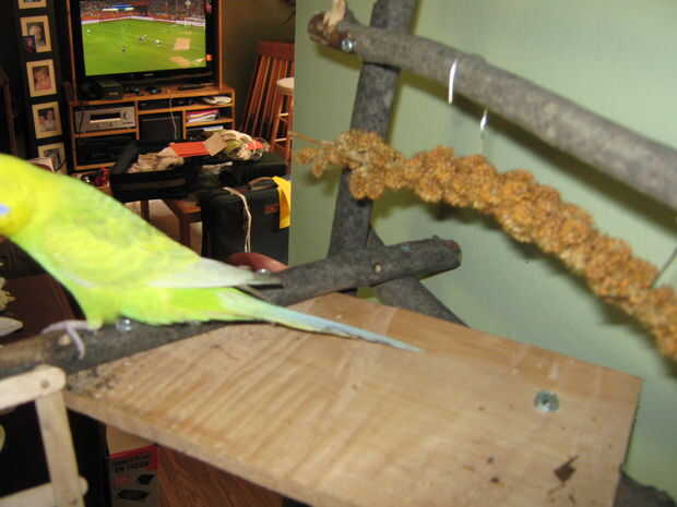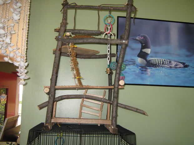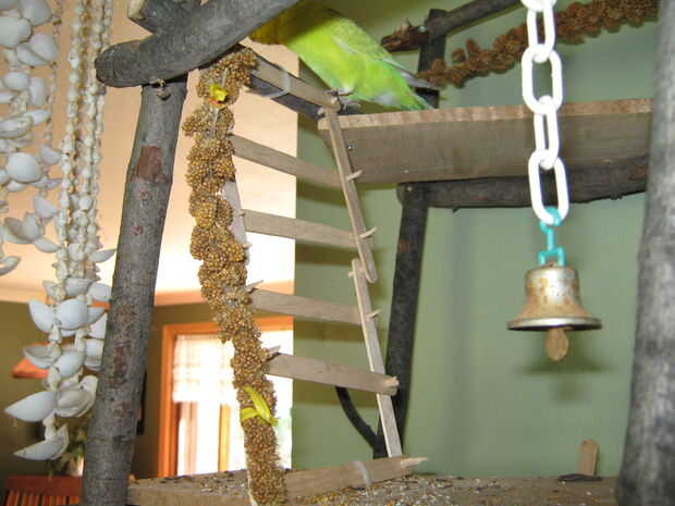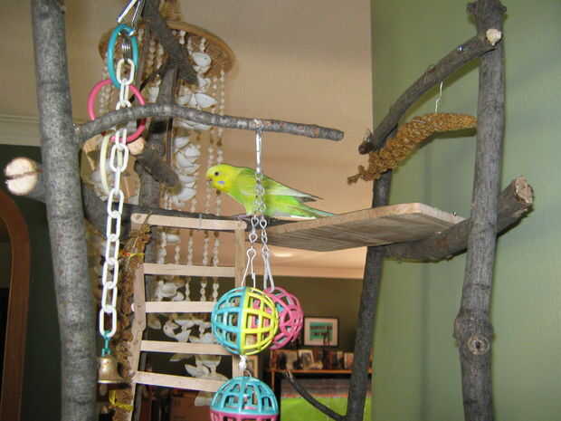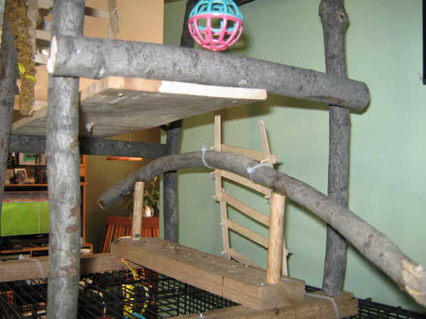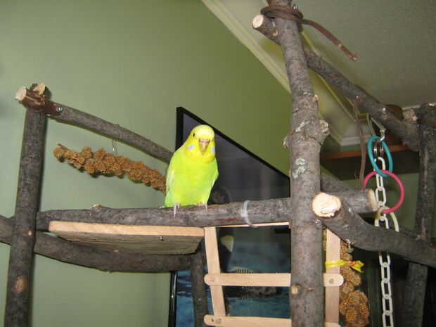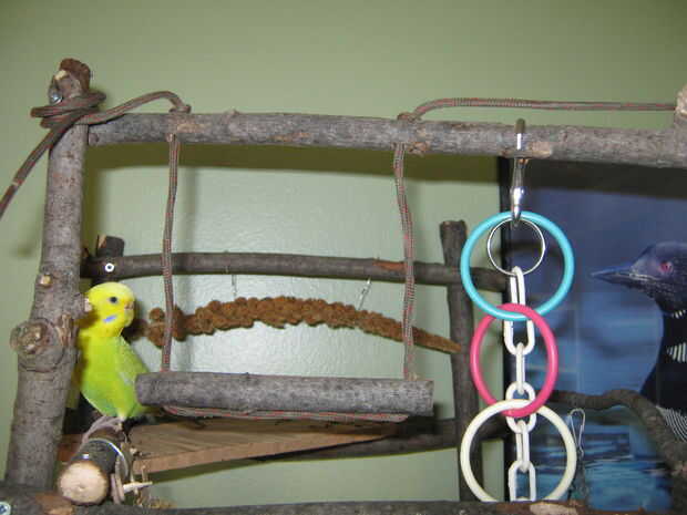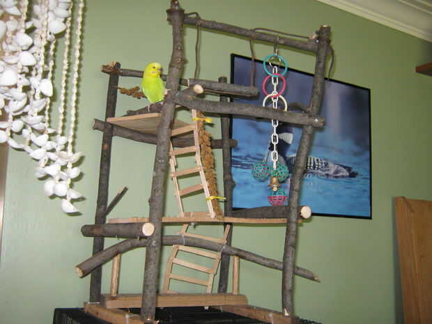 Hice este gimnasio para mi Periquito hermanos de pega que encontré en la casa, que cortado a la medida, pretaladrado y atornilladas para hacer el marco. También usé algunos restos de madera que tenía alrededor de los estantes y la base. Las escaleras están hechas totalmente de palitos. He utilizado ataduras para montarlos. Por último, colgó de los juguetes y el columpio y luego utiliza bolsa lazos para atar mijo del aerosol a la escalera y 2 clips para colgar algunas más mijo del aerosol en la parte superior. Limón (budgie) quiere subir las escaleras hasta la parte superior y se sientan en el estante superior para comer mijo o masticar los palos, que es bueno para su pico.