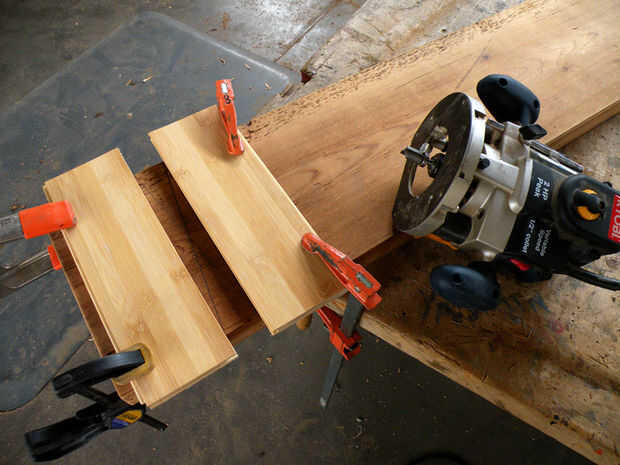 Encontrar el centro de la parte superior, luego medir 18" fuera de la línea central a cada lado. Ahora medir 1-1/2 más "a cada lado. Se trata de la anchura de la ranura que acepta las piernas. Línea de un pedazo de chatarra de 1/2" de espesor a ambos lados de su surco futuro. Tornillo o pinza a la pieza de trabajo. Ajuste la profundidad de la fresadora para cortar aproximadamente a la mitad de la profundidad de la pieza de trabajo. Girar sobre y dibujar hacia usted en lentos, parejos, asegurándose de que la parte lisa de la broca es montar a caballo apretado a su tablero de la guía. Una vez hecho esto, la arena a cualquier marca de router en la ranura que incluso para arriba.