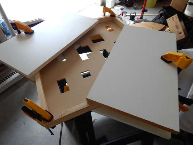 • Una vez que todas las secciones están conectadas en una caja, unir el marco y la cara. Algunas pinzas o pesos ayudará a mantener todo junto hasta que el pegamento se seque.