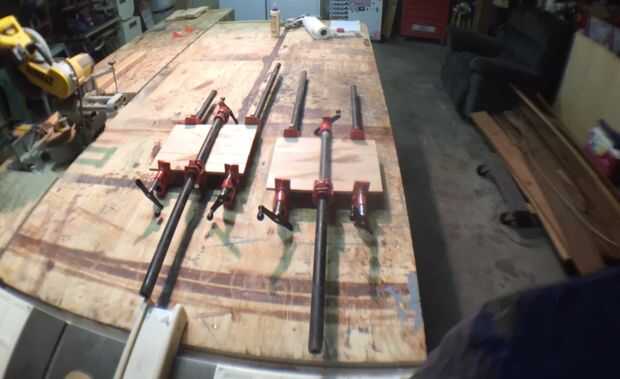Pegue las piezas 6 que solo cortes 2 paneles separados. Usé 6 abrazaderas para tubos, 2 debajo de cada borde, y uno en la parte superior para aplicar presión a los nuevos paneles. Asegúrese de no apretar en exceso las abrazaderas. Esto causará excesiva compresión de la cola y podría causar a los paneles cambiar y convertirse en irregulares en los extremos.