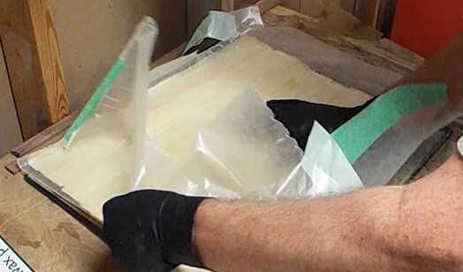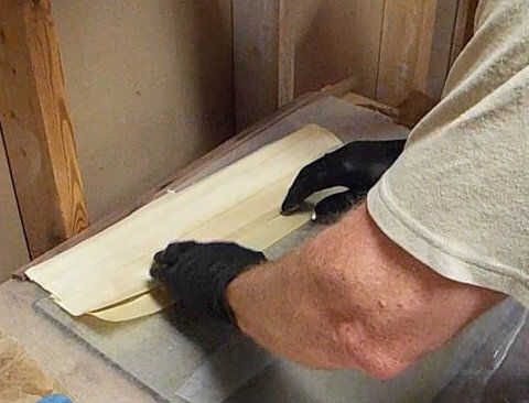Cubrir el panel inferior de la prensa con papel de cera. Llene el fondo de un recipiente desechable con cemento de contacto. Aplicar el cemento de contacto a un solo lado de una de las virutas con una espátula. Pone ese lado cementado contacto de la pieza para arriba. Aplique cemento de contacto a otro afeitado y colóquela al lado de la pieza original, también el lado pegajoso hacia arriba. Aplique cemento de contacto a otro afeitado y coloque este lado pegajoso hacia abajo en la superposición de los chips anteriores. Trabajar este patrón hasta que tenga una hoja de virutas que todavía caben en la prensa. Añadir una hoja de papel encerado sobre la hoja de virutas y luego la parte superior de la prensa en la hoja. Aunque probablemente no es necesario, dio las hojas alrededor de un día para curar completamente bajo el peso de la prensa. Retire la hoja de la prensa y retire cuidadosamente el papel encerado para evitar daños en la hoja de afeitar.