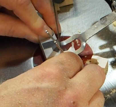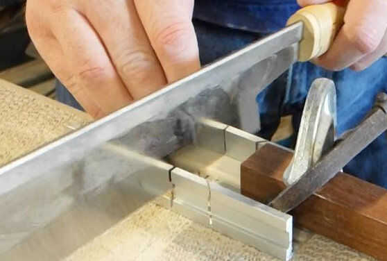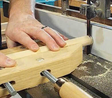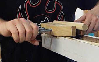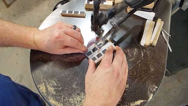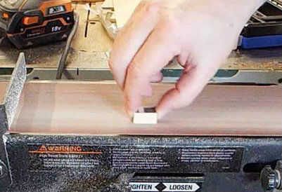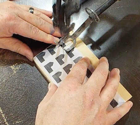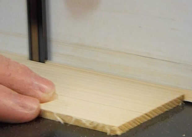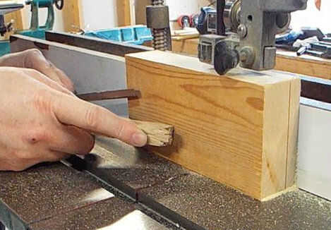 Mientras que la guía de Sierra de cinta está todavía en un listón se corta otra sección claro de 2 x 4 1/8", longitud no es importante, pero sería bueno poder obtener sobre 4-6 tramos de carretera. El listón se está inclinado 90 º sobre la mesa de Sierra de cinta y pequeños palos estrechos son arrancadas de la lama. Mantenga los dedos lejos de la lámina ya que estos son pedazos muy pequeños. Tomar los palillos y mano lijar para quitar la aspereza y falta de claridad de los cortes. Finalmente, los tramos se pueden cortar a la longitud en una caja de ingletes con un bloque de tope.