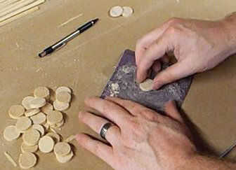 El rollo de fichas son las fichas redondas en los colonos de Catan que se colocan en cada uno de la tierra de los azulejos que indican quién recibe los recursos cuando se rueda el número. Los restos de la espiga que se convirtió en el torno para el meeple pueden utilizarse para crear estas fichas. Ronda de artículos en una sierra de cinta que llevará a cabo para prevenir el balanceo lejos del operador. Mientras que la guía de la sierra todavía se establece en 1/8", abrazadera de la espiga en una mano de madera tornillo de sujeción. Luego corte el extremo de la espiga contra la guía, manteniendo los dedos lejos de la lámina. Obtener hasta los tokens y lije los bordes y las superficies de los tokens suave.