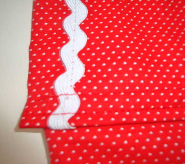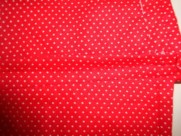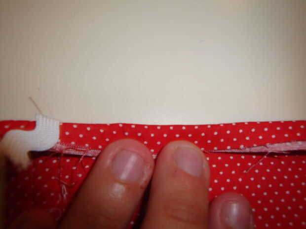 Luego colocas el pedazo de correa recién doblada debajo de la pieza de cintura recién doblada. manera que la pieza de cintura en la parte superior si estás buscando en él desde la parte delantera del delantal. Entonces usted será coser abajo una vez para conectar la correa a la cintura. Esta es la conexión primaria. También agregará una segunda puntada recta junto a la primera para que la cintura se ve más acabada en la parte delantera del delantal.