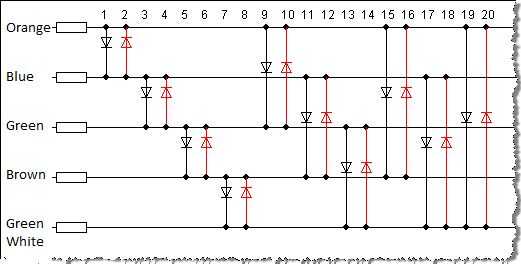 Esta tecnología no es muy impresionante cuando sólo con seis LEDs, sin embargo cuando ampliamos la cantidad de pines, descubrimos que este sistema puede conectar {pins(pins-1) = LEDs} en el caso de pernos de 5 es 5 x 4 = 20 LEDs, exactamente la cantidad que queremos.