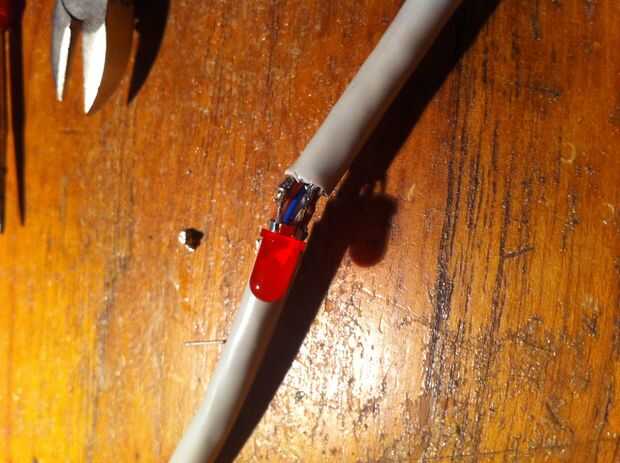 Indicar en el cable de LAN donde desea que los LEDs que. Tenerlos en una distancia fija aparte se ve mucho mejor que tener 15 LEDs en un lado y 5 en el otro. Un marcador de base de alcohol sería mejor para esto, sin embargo haría cualquier indicación. Comienzo cortando algunos del aislamiento exterior de la LAN de cable para que pueda trabajar con los alambres más pequeños.