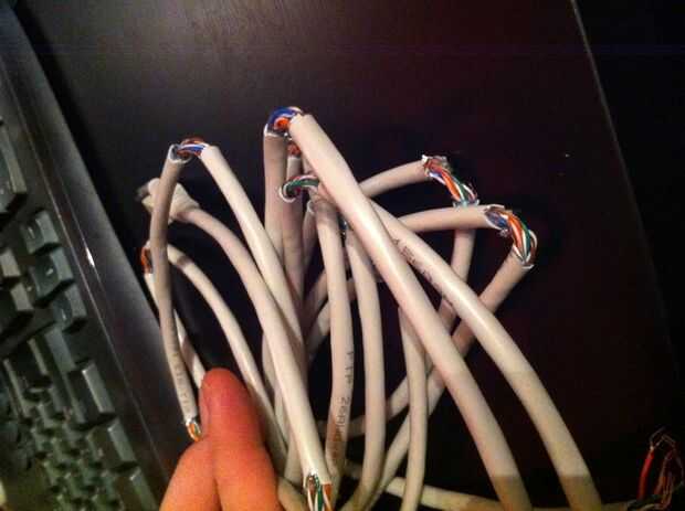 Entonces se iniciará la construcción real. Conectar los LEDs a los cables justas en el cable LAN y asegúrese de utilizar el cátodo o - y el ánodo o + lateral (pata larga) de los LEDs apropiadamente. LED 1 tendría conectado el cable naranja y la pata corta al alambre azul y así sucesivamente para los otros diecinueve LEDs largos de la pierna.
