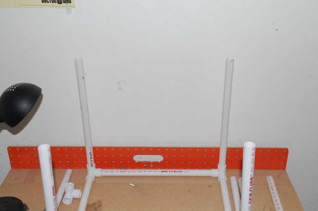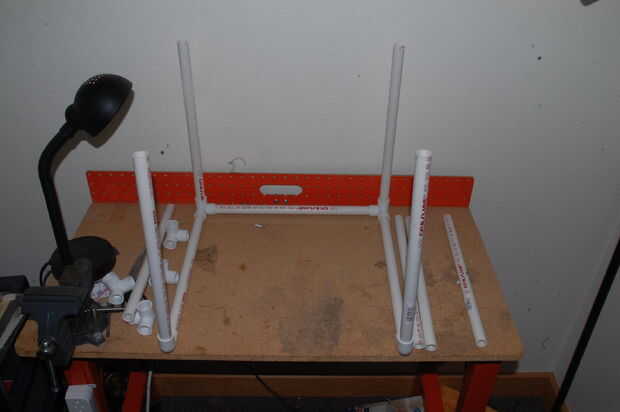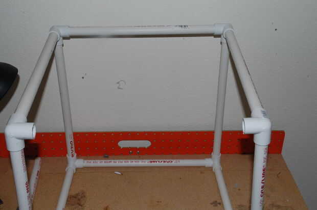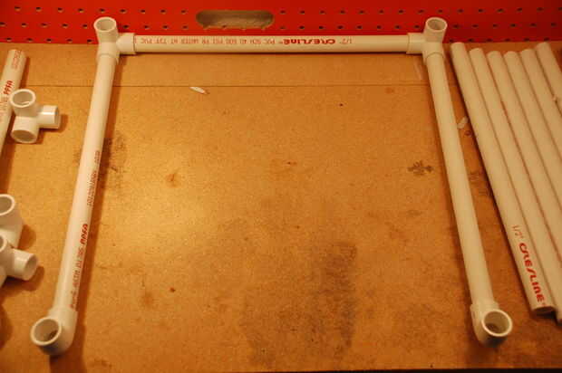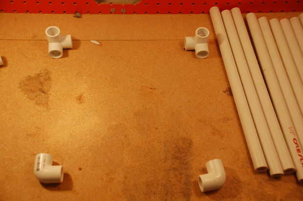 Comenzar con la parte inferior del marco. Las juntas de dos 90 grados irá en la parte delantera. Dos de las tres patas juntas irá en la parte posterior. Por lo tanto, debe usar tres secciones de tubo para unir estos. Lo hice otra vez, utilizaría las uniones de esquina de tres lados en la parte delantera en su lugar, aunque originalmente había planeado no tener una base sólida. Esto hablaré más adelante. También, agregar tres empalmes de la esquina cara habría costado me y extra $2 o menos.