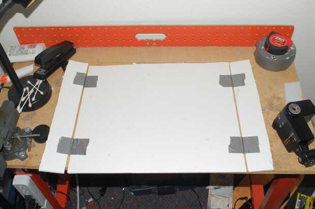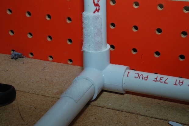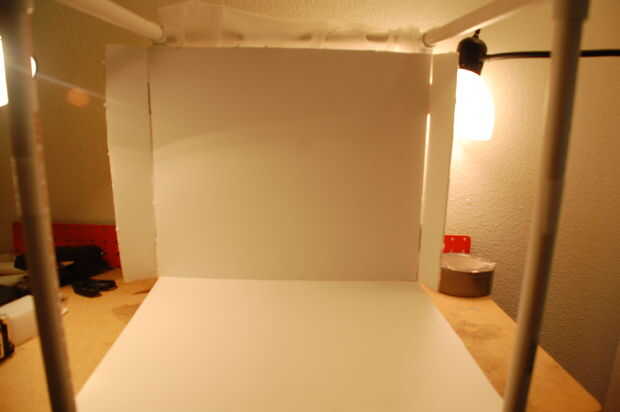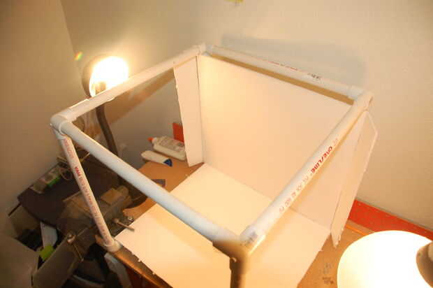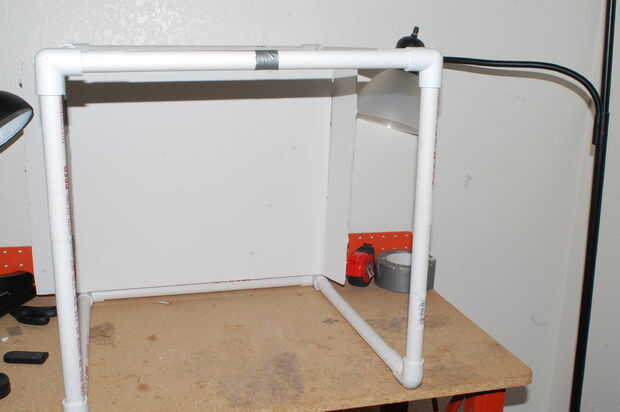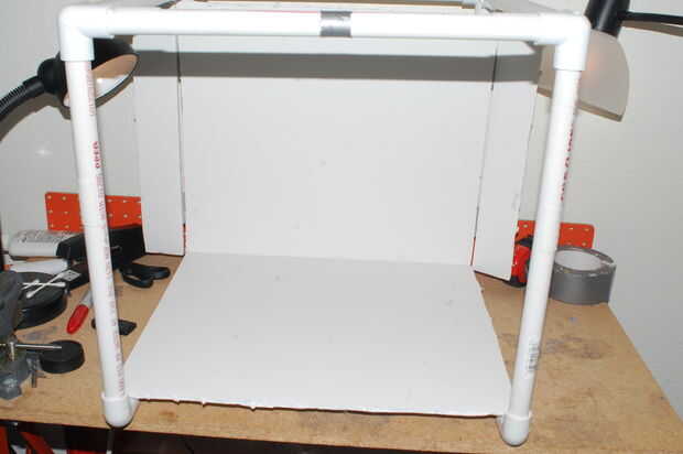 Ahora, aquí es donde el velcro que primero entran en juego. El velcro sujetar la cartulina en su lugar y evitar desplazamiento o caída. Tendrá cuatro de 1.5" de largo pedazos. Esto es difícil de explicar en palabras, así que por favor refiérase a las fotos. Colocarlos en los tubos de izquierda y derecho de la parte inferior y la parte trasera, justo al lado de las piezas de empalme (ver fotos). Realmente no importa si usted puso el gancho o lazo lateral en las tuberías, pero sugiero usar los ganchos para los tubos de la parte inferior, y mezclan los lazos para el telón de fondo (o vis versa), para evitar de conseguir las dos piezas de espuma. Ahora las piezas que emparejan en el foamboard y engancharla. Realmente no tengo que explicarlo, pero nunca se sabe.