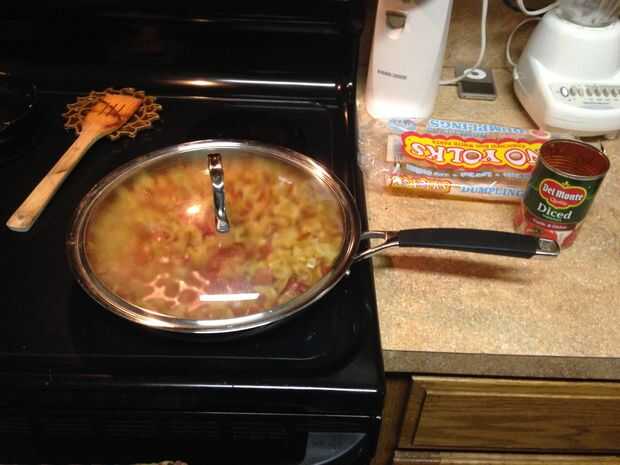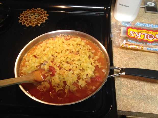 Añadir en el paquete de fideos. Relleno de la salsa de tomate vacía puede con agua caliente y agregar esa agua bastante más para llegar a los lados de la olla. El agua no debe cubrir los fideos.